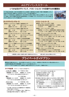 バリエーションコース第1回 バリエーション入門Ⅰ(初級)表妙義山縦走(危険箇所の通過方法) *要前泊4/08(日) 講習費 ¥35,000第2回 バリエーション入門Ⅰ(初級)西穂高岳~ジャンダルム~奥穂高岳縦走(危険箇所の通過)7/13(金)~15(祝) 講習費 ¥65,000 宿泊 山小屋第3回 バリエーション入門Ⅱ(初~中級)北穂東稜&前穂北尾根(ルートファインディングとロープワーク)7/21(金)~23(日) 講習費 ¥65,000 宿泊 山小屋第4回 バリエーション入門Ⅲ(中級)剣岳・八ツ峰縦走(雪渓の処理の仕方と安全確保)7/27(金)~29(日) 講習費 ¥65,000 宿泊 山小屋第5回 バリエーション入門Ⅱ(初~中級)槍ケ岳・北鎌尾根(ルートファインディングとロープワーク)8/10(金)~12(日) 講習費 ¥65,000 宿泊 山小屋第6回 バリエーション入門Ⅲ(中級)剣岳北方稜線縦走(ルートファインディングと雪渓の処理)8/17(金)~19(日) 講習費 ¥65,000 宿泊 山小屋ロッククライミングコース第1回 ロッククライミング基礎①(確保技術入門)場所 三ツ峠 日時 04/07(土)~08(日)講習費 ¥35,000 宿泊 山小屋第2回 ロッククライミング基礎②(懸垂下降入門)場所 三ツ峠 日時 04/14(土)~15(日)講習費 ¥35,000 宿泊 山小屋第3回 マルチピッチクラミング(リード&フォロー講習)場所 三ツ峠 日時 06/02(土)~03(日)講習費 ¥35,000 宿泊 山小屋第4回 セルフレスキュー(岩壁からの救助技術講習)場所 三ツ峠 日時 06/09(土)~10(日)講習費 ¥35,000 宿泊 山小屋第5回 ユマーリング講習(フィックス工作&ユマーリング技術講習)場所 三ツ峠 日時 06/23(土)~24(日)講習費 ¥35,000 宿泊 山小屋第6回 エイドクライミング講習(人工登攀技術講習)場所 三ツ峠 日時 07/07(土)~08(日)講習費 ¥35,000 宿泊 山小屋いつかは自分でリードして、バリエーションルートを目指すための講習会AGアドバンススクールガイド登山の枠を超え、自身で安全管理をすることを前提に、縦走登山から岩登り・沢登り・実践登攀・レスキュー技術などを体系的に習得することを目的としたのが、このAG登山教室です。各回、テーマが違う独立した講習会なので、自分の苦手な分野だけ参加して頂くことも可能です。また、2~4名の少人数制で、担当する講師が参加者の技術習得度をしっかり把握してから、それぞれのレベルに合わせ指導しますので、効率よくレベルアップが図れます。※講習費には宿泊・交通費・食事代・保険料は含みません。 ※最小催行人数は2名様となります。プライベートガイドプラン講習会の日程が合わない。 自分の登りたい山がツアーにない。 仲間同士で気ままにガイド登山を楽しみたい。ご自身の遠征登山等の事前練習、シミュレーション登山をしたい。プライベートガイドは如何ですか。皆様のご要望に合わせアレンジします。ご相談ください。ガイド料金表 (ガイド1人・1日あたりの料金です。)ハイキング・一般登山 ロープを使わない登山無積雪期 30,000円 積雪期 40,000円(ガイド1名に対し10名のお客様までをご案内します。)登山 ロープを使う登山無積雪期 40,000円 積雪期 50,000円(ガイド1名に対し3名のお客様までをご案内します。)バリエーション ロープを使う難しい登山無積雪期 60,000円 積雪期 75,000円(ガイド1名に対し2名のお客様までをご案内します。)*山小屋代、登山口までの交通費等のガイド諸経費を、別途ご負担いただきます。 *テント山行、ビバークの場合は、別途、ご相談下さい。*海外遠征の同行も可能です。ご相談下さい。【プライベートガイドのキャンセル料に関して】登山開始日の3週間前~3日前 50% 登山開始日の前々日~前日 75%当日、無連絡不参加の場合 100%【悪天候等の予期できない事由により山行を中止・変更する場合】 ガイドが自宅を出発する前に中止・・・ガイド料を全額返金します。集合時点で中止・・・・・・・・・・・・・・・ガイド料の75%を返金します。 登山、講習開始後・・・・・・・・・・・・・ガイド料の返金はありません。 ルート等の変更・・・・・・・・・・・・・・・ガイド料の変更はありません。*飛行機などのガイド交通費のキャンセル料等が発生する場合は、実費をご請求させて頂く場合がございます。-6-